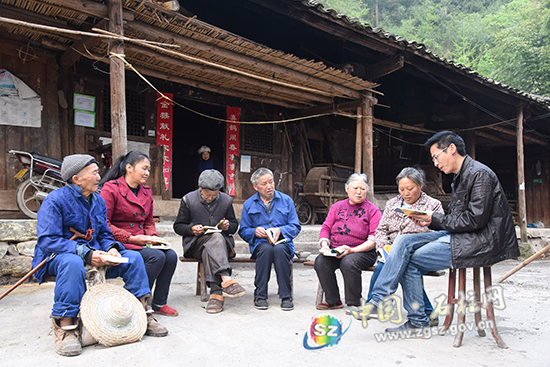 谭祥华(右一)利用“精神扶贫系列读本”作院坝宣讲