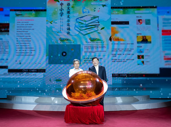 △中宣部副部长、中央广播电视总台台长慎海雄,教育部部长陈宝生共同见证“中小学语文示范诵读库”首批100篇音频教材正式上线发布。(摄影:新华社记者 沈伯韩)